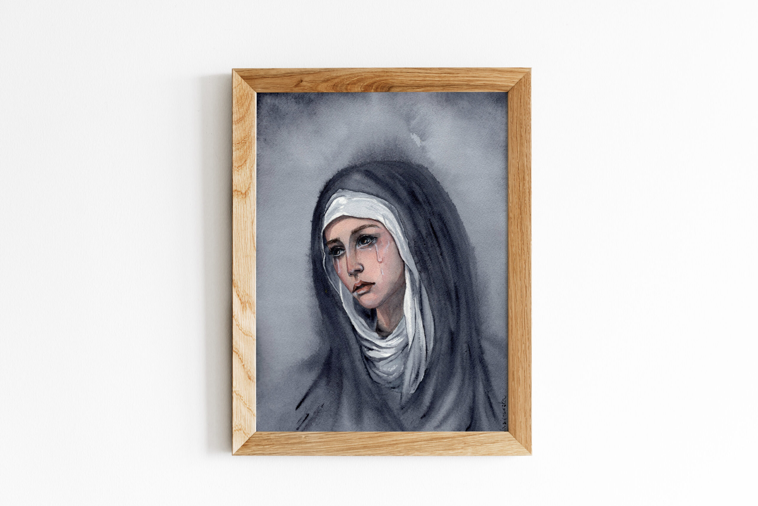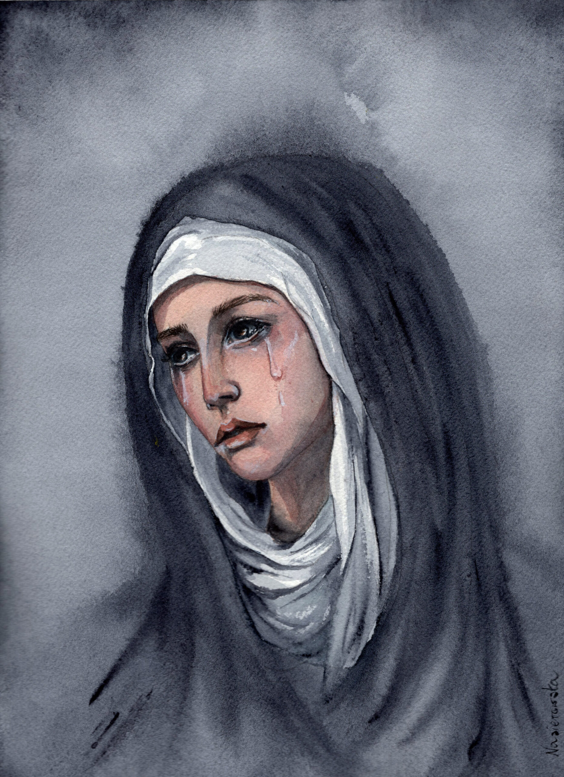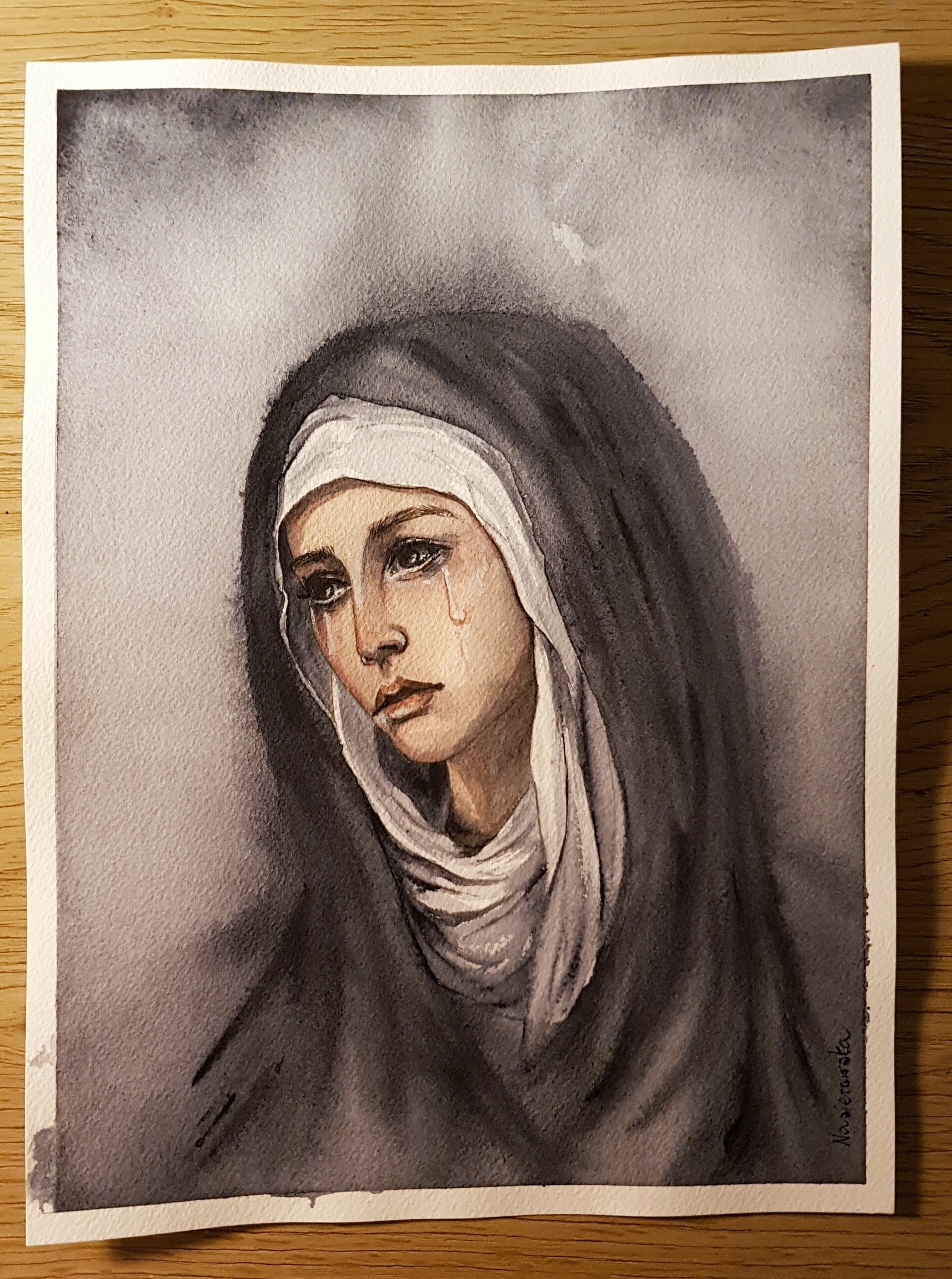 Autorska akwarela przedstawiająca Matkę Bożą Bolesną.