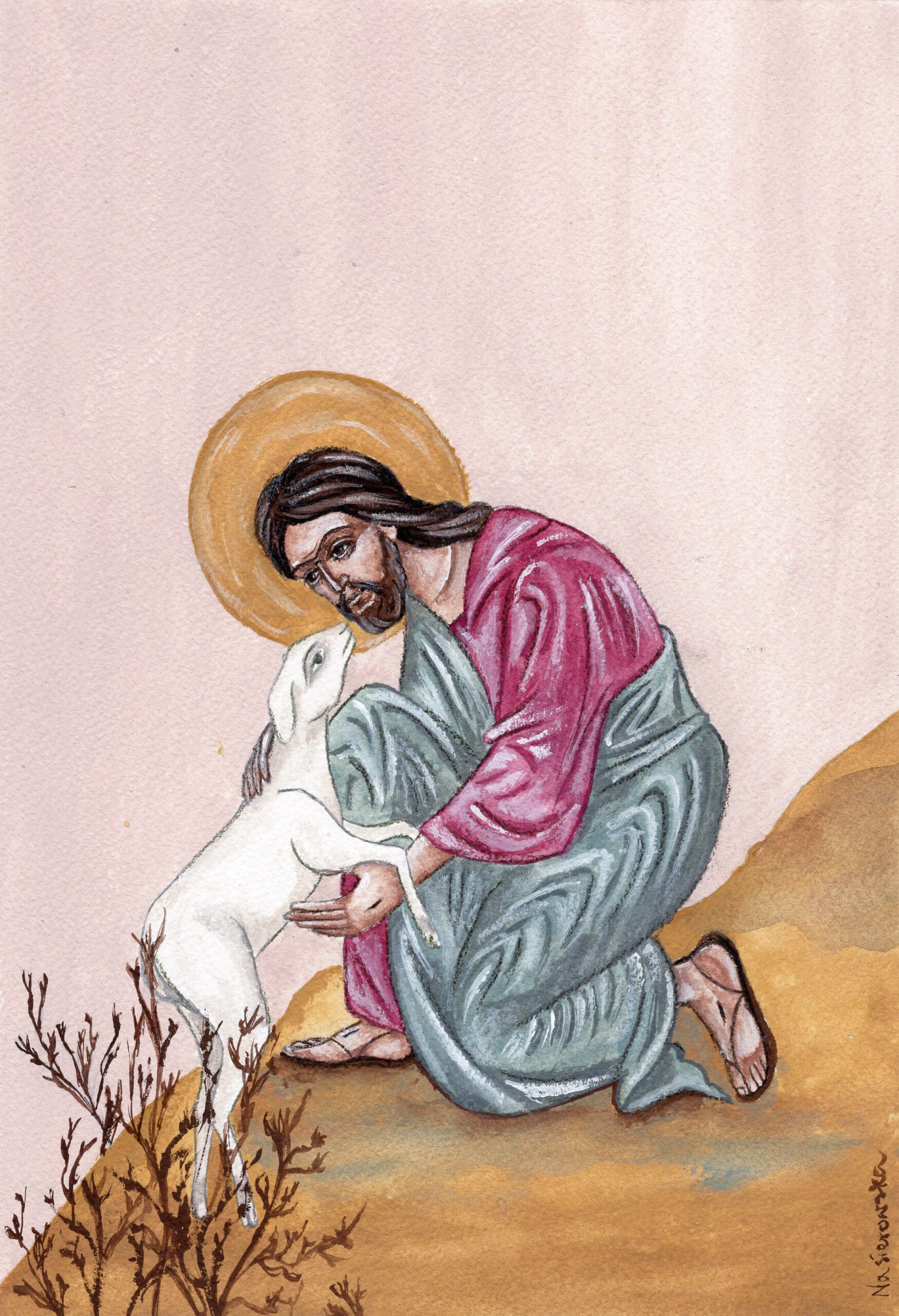 Wydruk na podstawie autorskiej pracy inspirowanej ikoną Dobrego Pasterza, malowanej gwaszem, w jakości fine art, na matowym papierze o gramaturze 300 gsm z wyraźną fakturą.