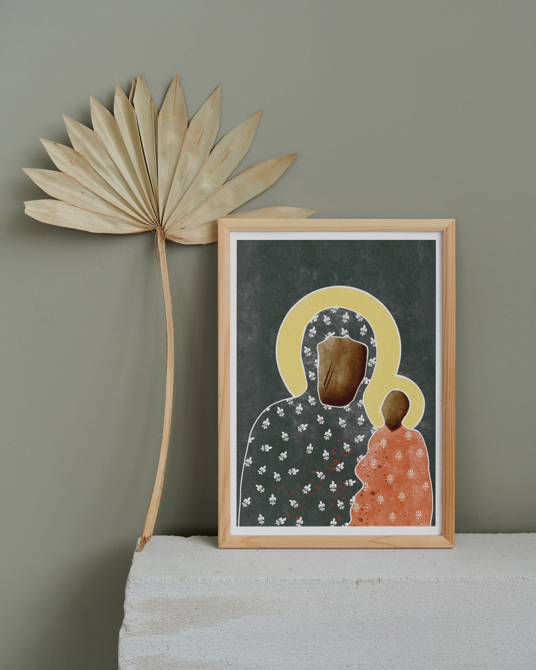 Wydruk autorskiej pracy cyfrowej w jakości fine art, na matowym papierze o gramaturze 300 gsm z wyraźną fakturą.