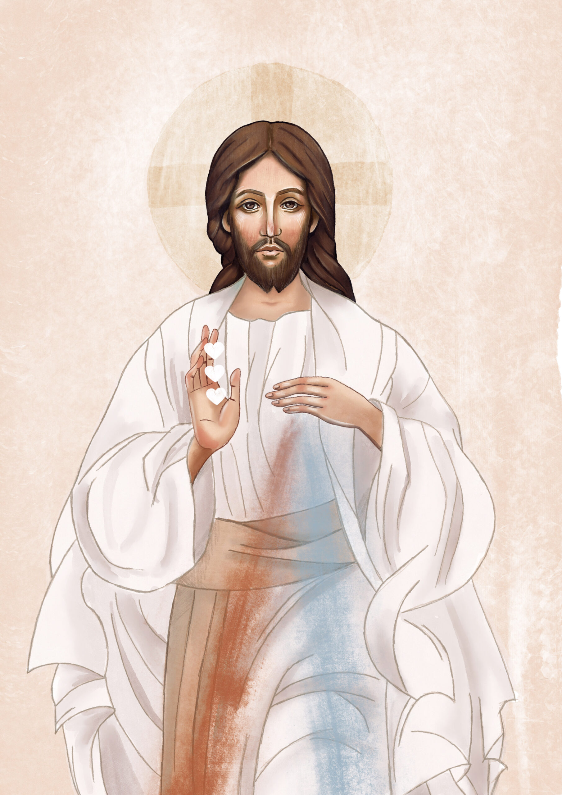 Wydruk autorskiej pracy cyfrowej, wzorowanej na obrazie „Jezu, ufam Tobie” w jakości fine art, na matowym papierze o gramaturze 300 gsm z wyraźną fakturą.